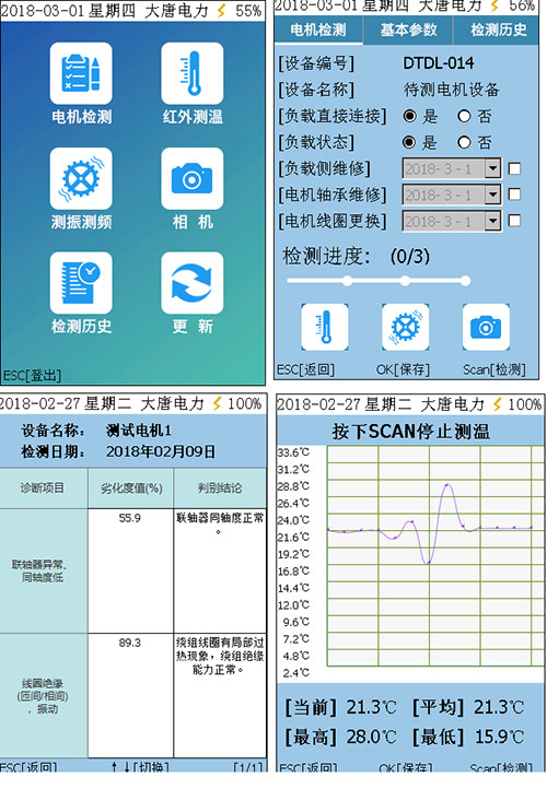 可以对观察类、记录类、测温类、测振类、测电流成份多种数据类型进行数据记录,并支持振动频谱分析数据的记录。